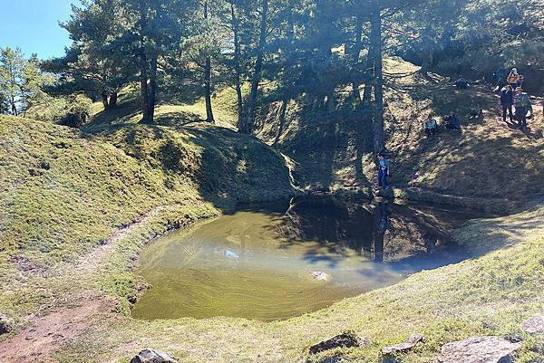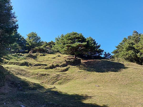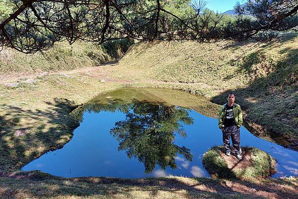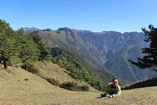 這個山坡宛如滑草場,老公趴下來,作勢往上爬,旁邊山友也跟著學他,很有意思!