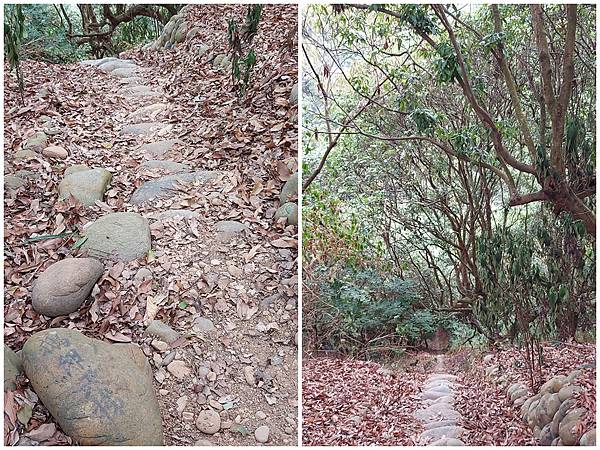 通往挑水古道叉路的鵝卵天梯,不過沒有特別明顯的指標,而是寫在石頭上!