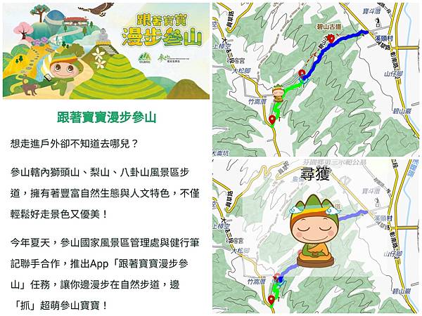 但後來想到要玩一下健行筆記的「跟著寶寶漫步參山」尋寶換餐具活動,只要走參山轄內獅頭山、梨山、八卦山風景區其中一條步道,就可以換餐具喔!分別是叉子、湯匙和筷子,這次就挑八卦山的「挑水古道」,剛好下一週又要去走梨山的「德芙蘭步道」,所以至少可以拿到兩樣餐具了!