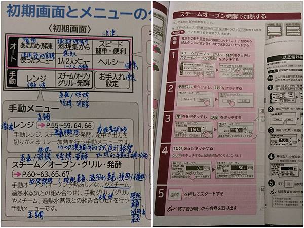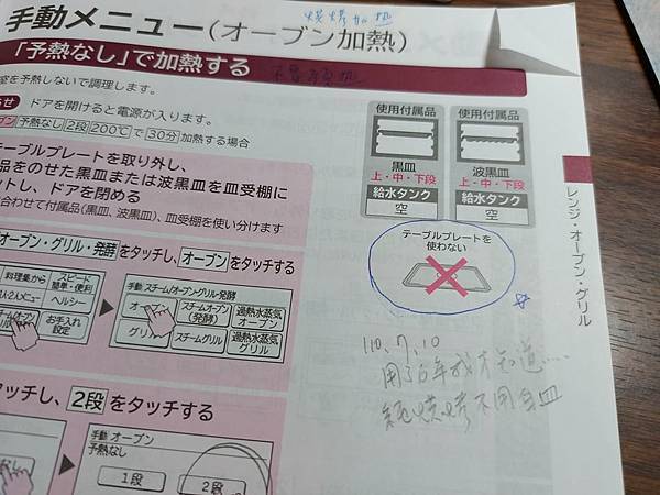 好笑的是,我竟然用了六年、最近跟同事聊到水波爐的「蒸氣」功能,想說幾乎沒用過,才又拿出日文說明書閱讀,這才發現我這台水波爐使用「手動烘烤」功能時那個白盤其實是要拿出來的!!