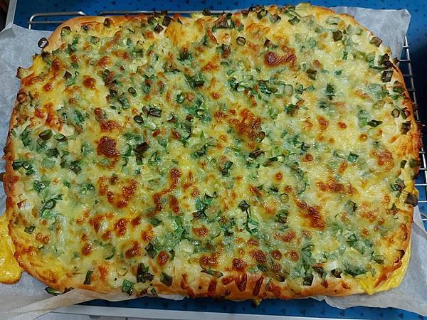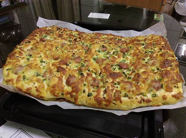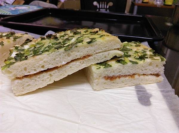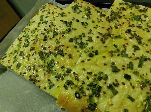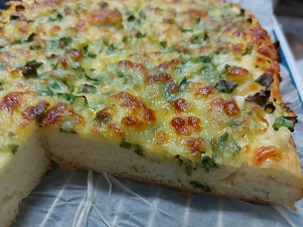 這一大片平板蔥花起司麵包,我可以切成8片,一半先冷凍起來,再跟其他麵包交錯著吃,才不會吃膩!