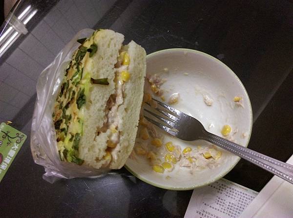 蔥花起司麵包直接吃就很有味道,若只是純蔥花麵包比較沒味道,我就會再夾肉鬆沙拉。