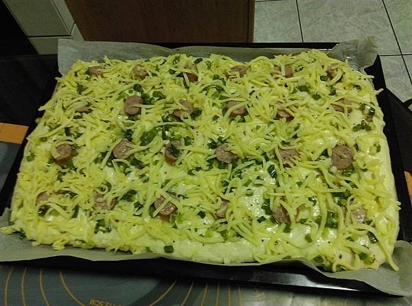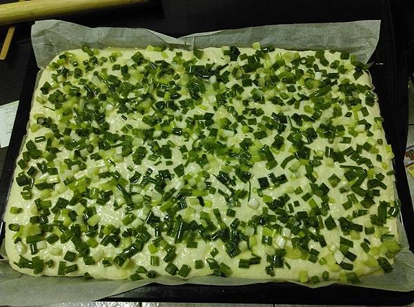 這時間準備蔥珠、加上一點鹽、黑胡椒、油和蛋液,均勻抹在麵皮上。