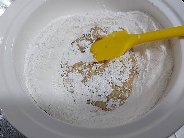 粉和糖水攪拌均勻,有的配方用滾開的糖水,有的用放涼後的糖水,我選擇用後者。