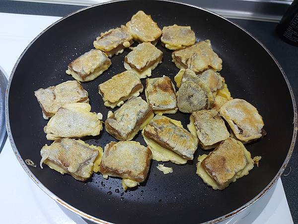 沾麵糊煎好還不錯,跟一般市售差異不大,算是成功啦!不過我更喜歡會爆漿的年糕,炸了會黏成一糰那種,可能跟粉水比例和粉類有關係。(糯米粉黏度高、在來米粉黏度較低,可能在來米多一點比較會爆漿吧?下次再來實驗看看!)