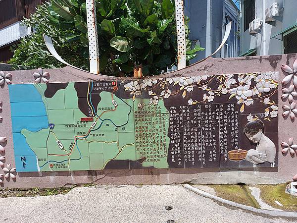 車子停在車城國小溫泉分校前的街道上,有一面介紹四重溪溫泉的磁磚牆。