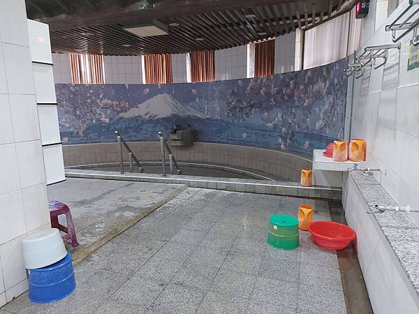 傍晚整個浴場幾乎座無虛席 ,還好還有最後一組水盆、水瓢和板凳可以用,我也沒有水龍頭那一排可坐了,只能到那兩池舀水出來找地方沖澡。