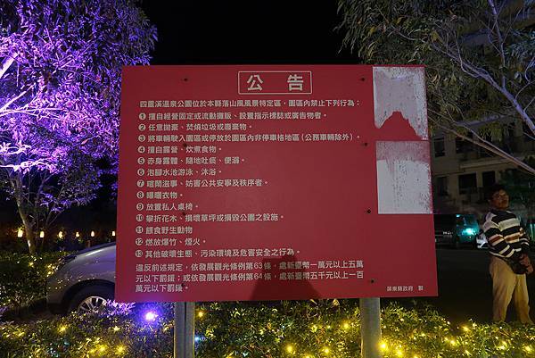 我們大約快6點時抵達四重溪溫泉公園前的路口,居然遇到交通管制不能進入,只好先把車停在車城國小溫泉分校圍牆邊。我們覺得晚一點應該就不會有交管了,先去洗澡,再把車開去停車場停放。後來才知道原來這段期間是2022年四重溪溫泉季(持續到2023年2月28日),四重溪溫泉公園有大片夢幻燈海,難怪遊客這麼多,才會交通管制。
