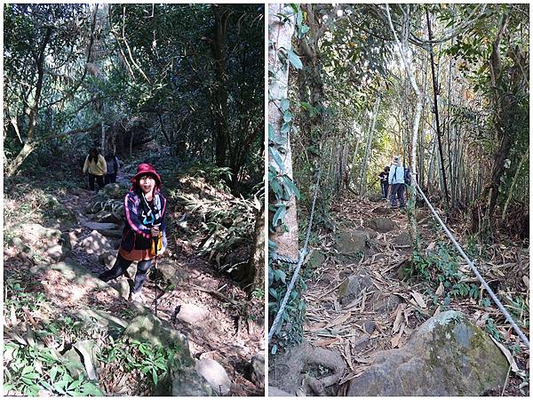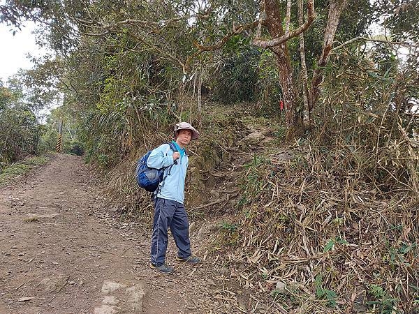 不久來到一個叉路,沒看到指標,但看到右上樹枝有綁布條,先取右上,後來才知兩條都可上竹子尖山,右上則是陡上捷徑,左上比較平緩,後來我們便這邊走下山。