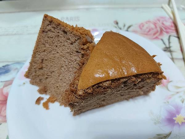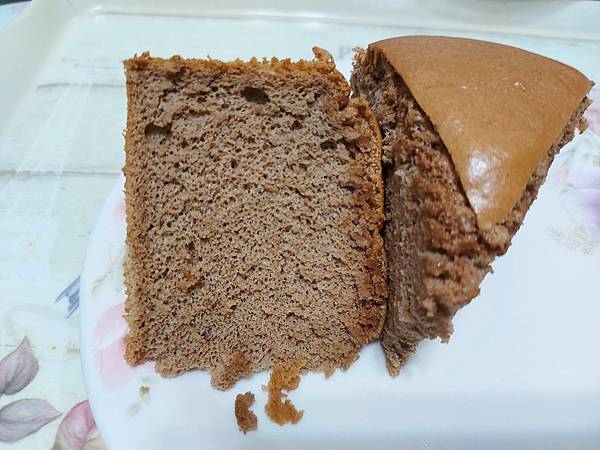 這是參考全燕麥無油配方,但我不太敢嘗試,因為我並沒有很愛燕麥,很擔心加了燕麥口感跟原味戚風蛋糕落差太大沒人捧場,所以還是有加植物油,燕麥磨成粉取代一半的麵粉,又加了一些巧克力粉,沒想到吃不出燕麥的味道,跟用低筋麵粉做的戚風蛋糕幾乎沒有什麼差異!