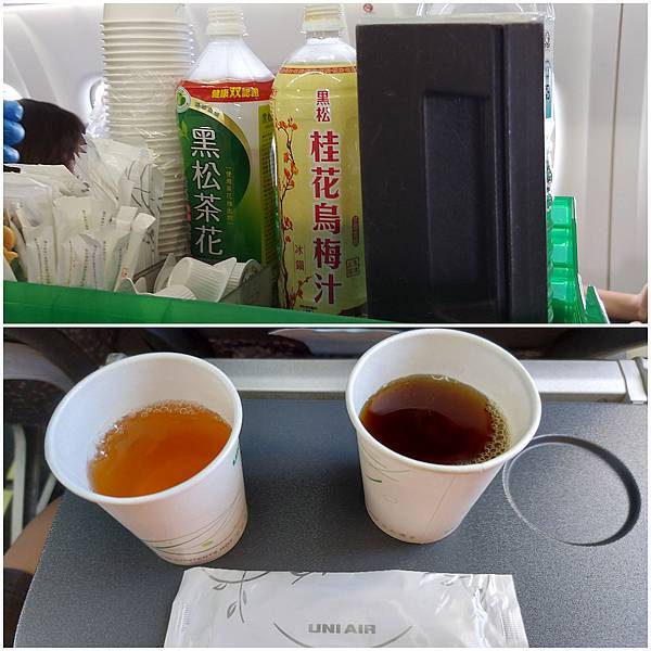 台中飛馬祖不過1小時,飛上一定高度後,會送一杯飲料。咖啡、熱茶、烏梅汁和綠茶任選。不像出國都還餐點可以吃....