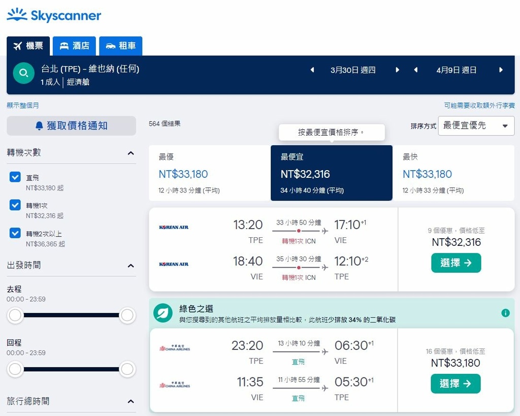 10月18日那天,無意中查到同時間飛往「奧地利」,排名第二低價的航點「維也納」(Skyscanner目的地設定飛往「世界各地」,會先出現國家選項,再來則是航點),以最便宜的價格排序,華航直飛居然是第二低價,只要33K!比最便宜的航班,轉機超過33小時的航班只多不到1千元耶!