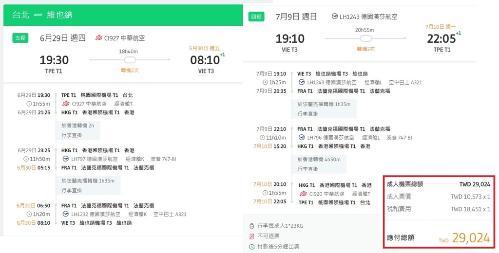 這價格跟之前轉機1次的價格幾乎差不多了!而且3/30(四)是晚上11點多飛機,當天也不用請假,下班再搭高鐵北上搭機都來得及!而且3/31上午6:30就抵達維也納了!回程4/9(日)上午11點多,抵達台灣是4/10(一)05:30,搭高鐵都可以趕上午10點回去上班,只要請假1天2小時就夠了!