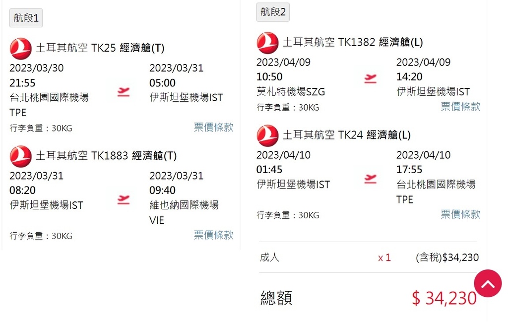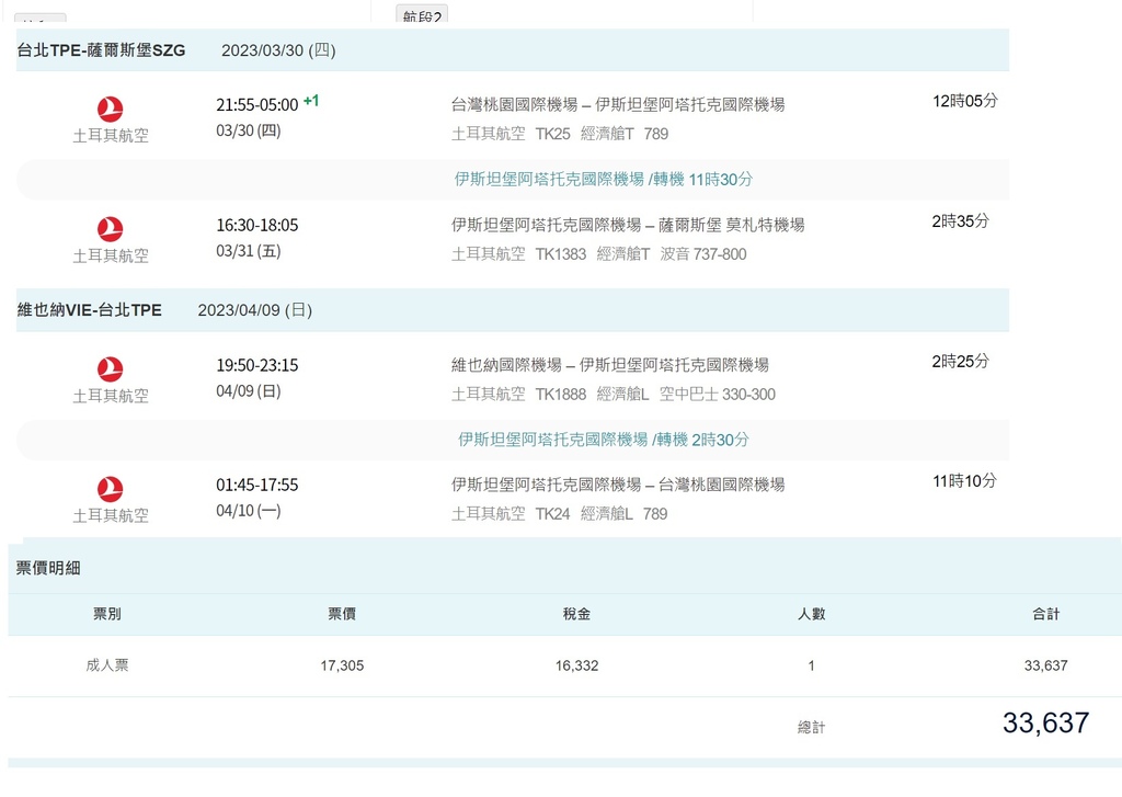 看到華航直飛維也納之後太興奮,我居然忘了下面土航「維也納」進、「薩爾斯堡」出這個選項也是不錯,可以參加16:00-21:30這場次的一日遊,不然這個價格可以多玩一日伊斯坦堡,也比較適合我這次的行程規劃,不用再從維也納拉車到薩爾斯堡,應該比較輕鬆,多請一天就可玩好玩滿!