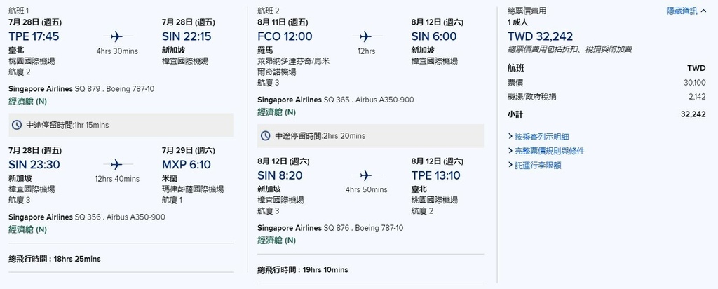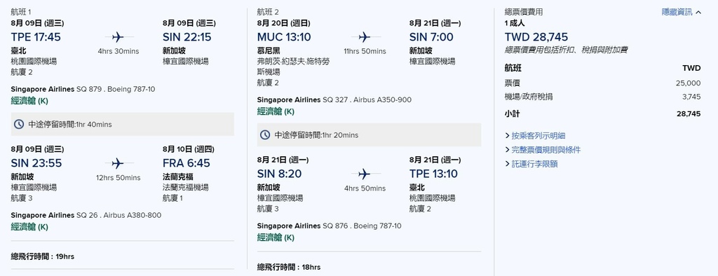 那時看到暑假8月還有新航3萬出頭的歐洲航點,像慕尼黑、法蘭克福、羅馬、米蘭這些,落在28K-33K左右,但因為這些價格都不可退票也不可改期,對家有高齡長輩的我們,總是有點擔心遇到突發狀況無法成行時,損失慘重!所以也遲遲不敢訂!
