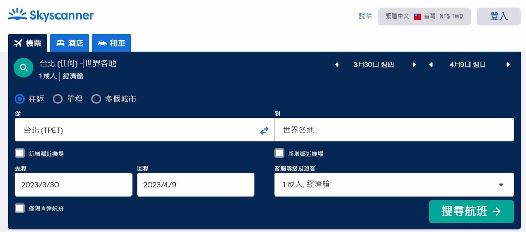 自從2022年9月22日中央指揮中心宣布將視疫情發展,將於10月13日將實施入境檢疫旅客免居家檢疫的訊息之後,我就開始上網找機票!我沒有特別想去哪裡,機票哪裡便宜哪裡去~~用Skyscanner查機票,目的地直接設定飛往「世界各地」!