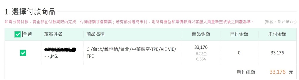為了要能進貴賓室,本來我要分兩筆訂單,只有先訂我的機票,但要付款時發現紅字那行字「如需分開付款...」,那就不用拆兩筆訂單啦!