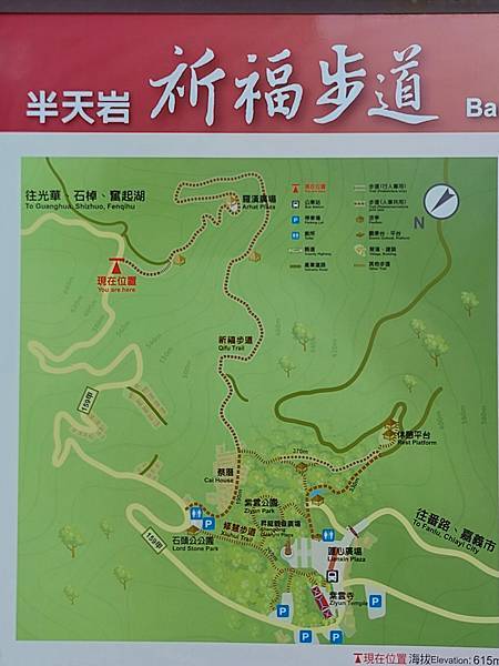 我們把車移過來這邊,決定從這走「祈福步道」到半天岩紫雲寺,回程再走159甲經「半天岩觀景台」回到停車場。
