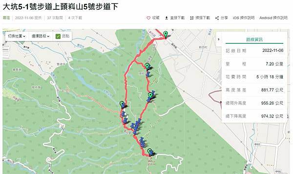 大坑步道群有好幾步道都可接上頭嵙山,40年前從識別證上爸爸註記的「第三步道」,應該是從3號步道上去。但我們配合車泊中興嶺停車場,就近從5-1號步道上、5號步道下,O型路線。