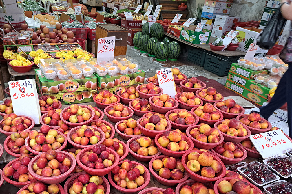 下面這些好幾排一籃5000韓元的應該是比較硬的甜桃,不是我要的那種很Juicy、咬下去會噴汁水蜜桃!我要的那種是後排一盒10000韓元的,跟樂天超市就差不多價格了!