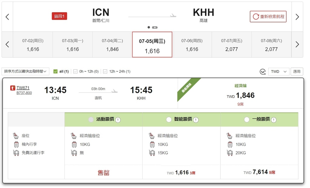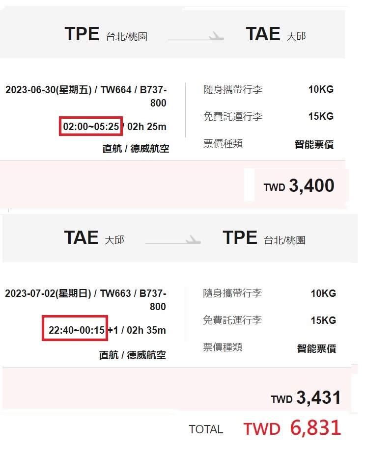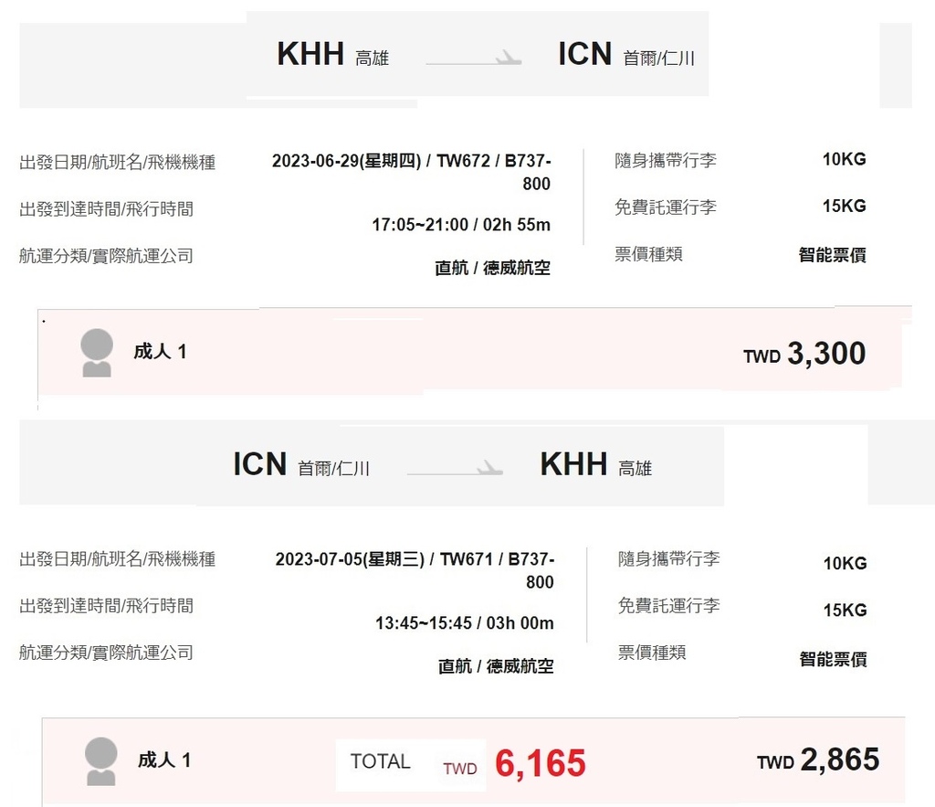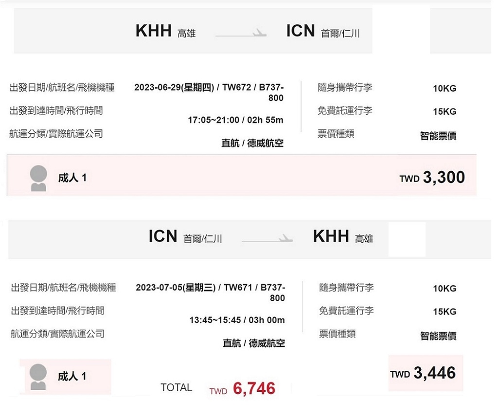 無意中想到查台中機場不知有沒有復航了?雖然沒查到,但想到可再查高雄出發,看到德威飛首爾還有幾天有零星最後2張的低價票,而且包含15kg託運行李!