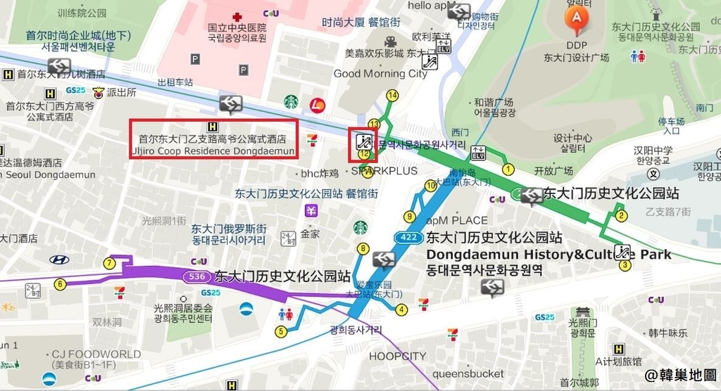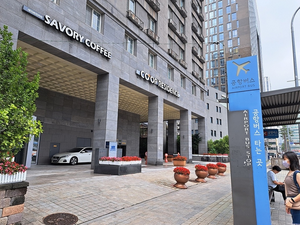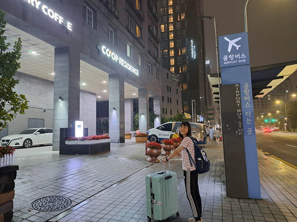 乙支路高爺商業公寓(Uljiro Co-op Residence)位在東大門設計廣場(DDP)斜對面的大馬路上,有6001機場巴士停靠。想說我們第一天可能都快凌晨12點才會到飯店,考量安全性,還是不要選那種在巷弄間的民宿比較安全,所以才會訂這家飯店。