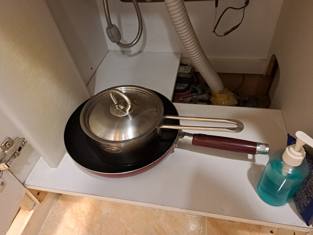 流理臺下方的鍋具和不沾鍋但沒鍋鏟,有砧板但沒刀子,看似完備卻有點不便XDD