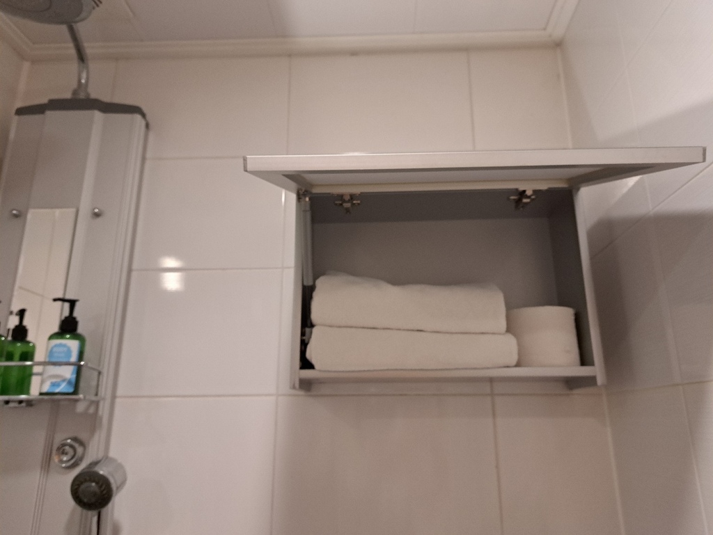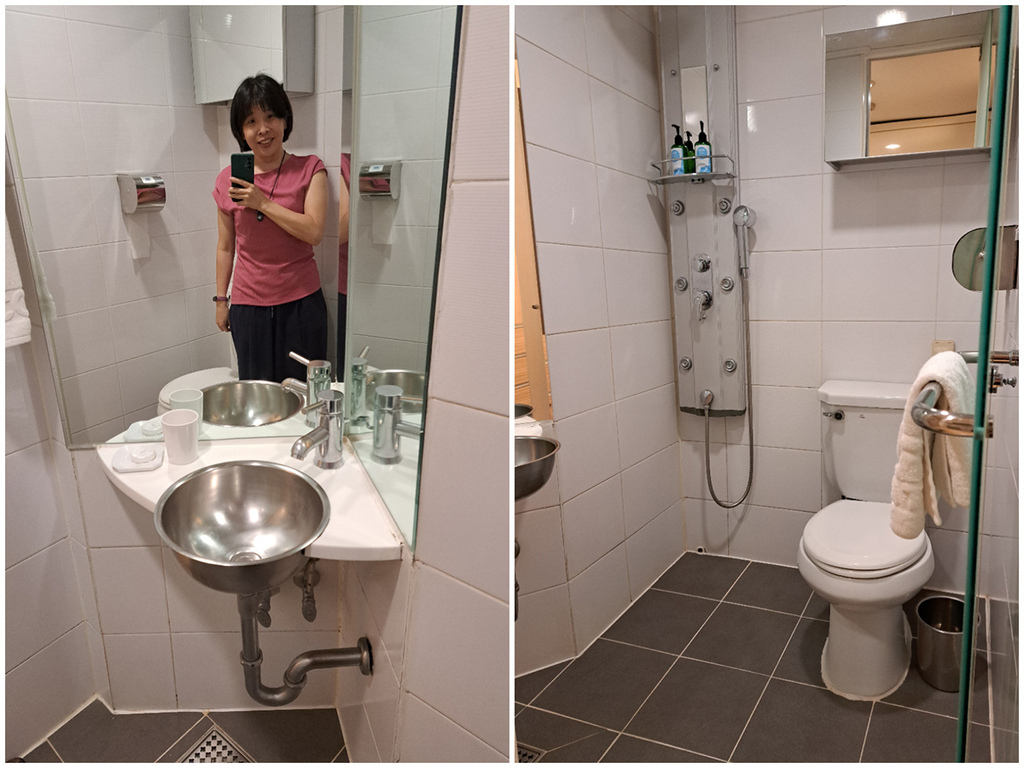 浴室也非常小!流理台的空間要放牙刷牙膏,還有女兒的牙套就顯得擁擠!不過還有壁式SPA,熱水也很夠力。也有吊桿,我每天簡單洗衣服還有地方吊掛就不錯了!