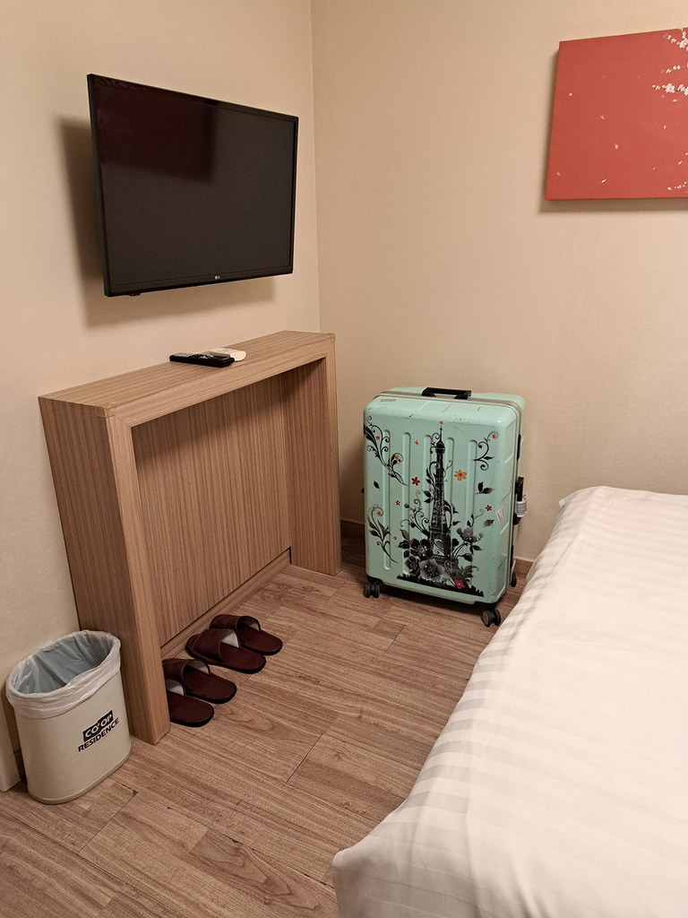 我覺得房間偏小,床也偏小,感覺上是140m那種小型雙人床。訂房時二單床房型比較貴,雖然後來又看到跟一大床價錢一樣,可是比我原本訂的貴太多,也就算了!當然二單床也勢必佔掉更多的空間了!