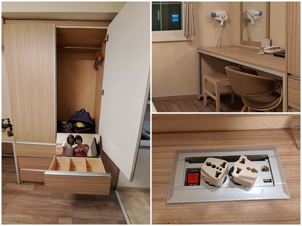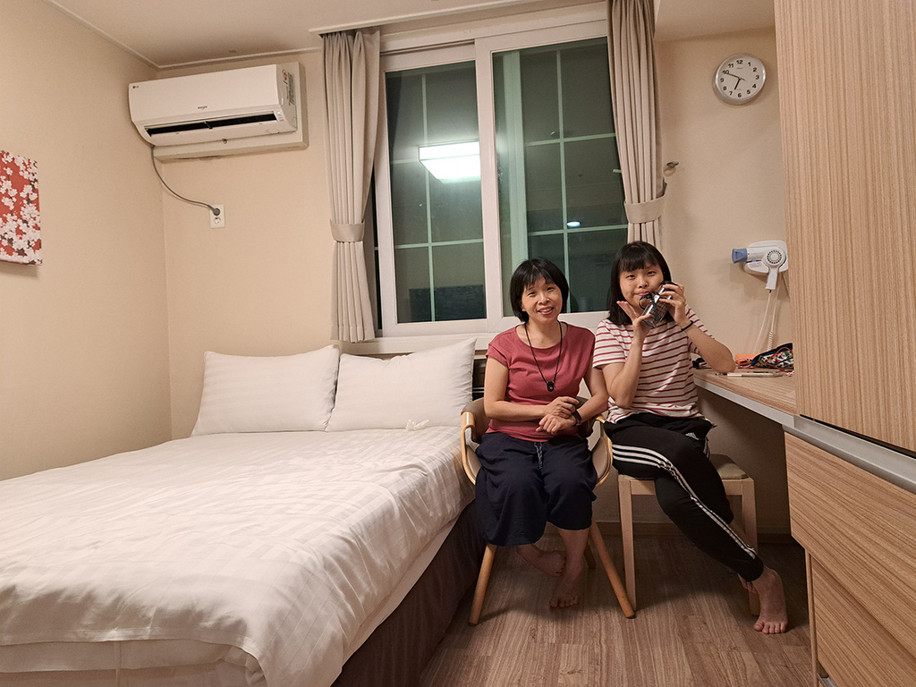 而且有小廚房,有種「家」的感覺,我和女兒晚餐很常回到飯店才吃(前一晚打包的),像安東燒雞海鮮鍋、申美京辣炒雞排、陳玉華奶奶元祖一隻雞,我們都沒吃完打包回飯店隔天晚上吃,再搭配一點水蜜桃、小吃、香蕉牛奶,也省了一點餐費XD