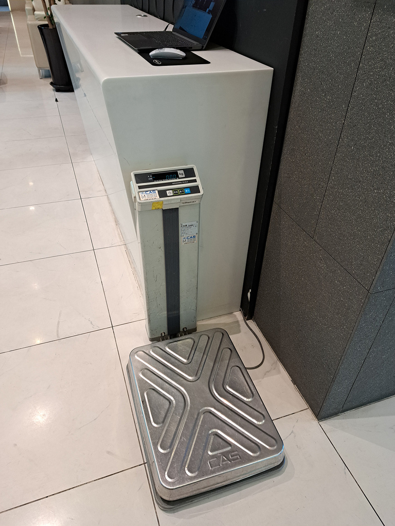 旁邊也有提供筆電和磅秤喔!我的行李秤疫情期間沒出國不知塞到哪了,今年要出國就找不到!加上德威1人僅有15kg託運行李額度,雖然社團都說可以2人合併計算,但出發時在高雄機場問地勤,台灣這邊可以,但韓國這邊她也不敢跟我肯定,所以要把27吋行李箱控制在15kg內,就很需要磅秤了! (回程在仁川機場有問德威地勤人員,確定是可以2人合併計算喔!)