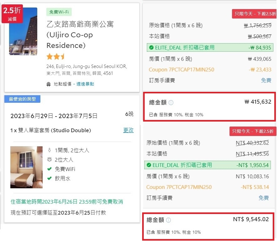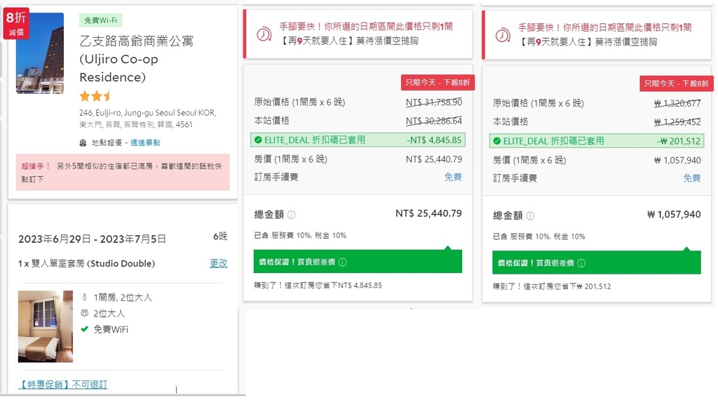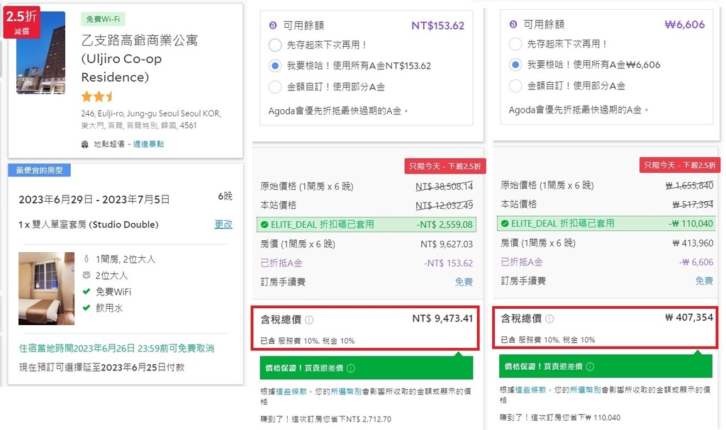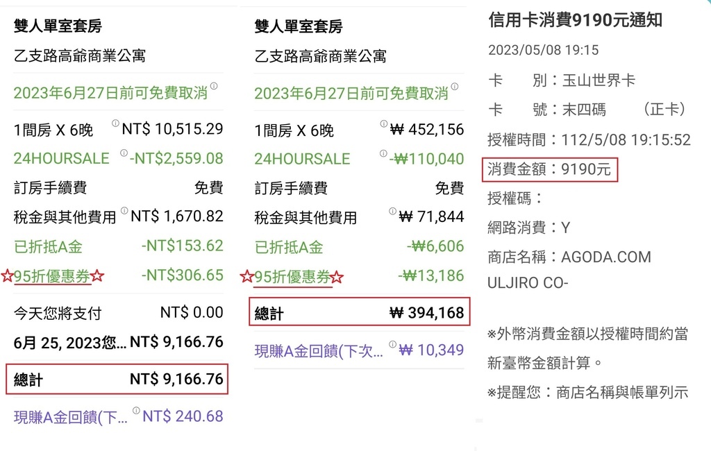 4/27訂了機票後,5/1在Agoda查到的價格是415,632韓元,以台幣計價是9,545元。