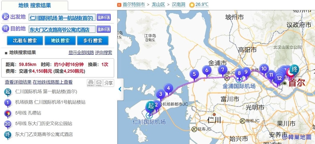 出發前用韓巢地圖搜尋地鐵路線,目的地設東大門歷史文化公園站,就是教我們在孔德轉5號線;改設飯店,結果也是一樣,我當然就在孔德站轉乘啦!