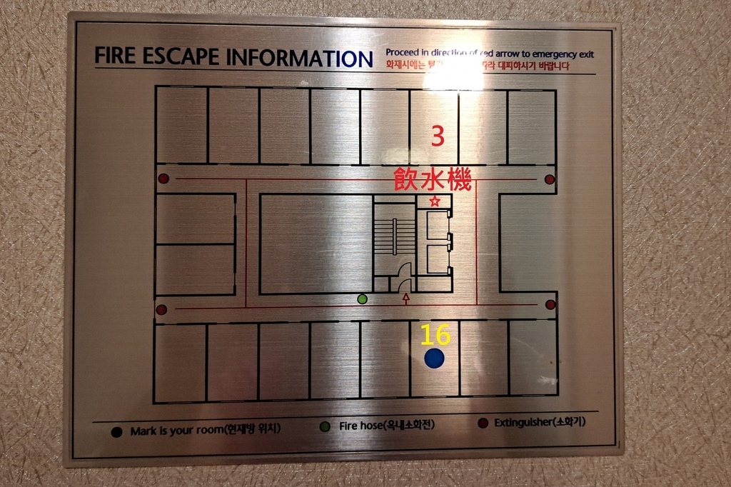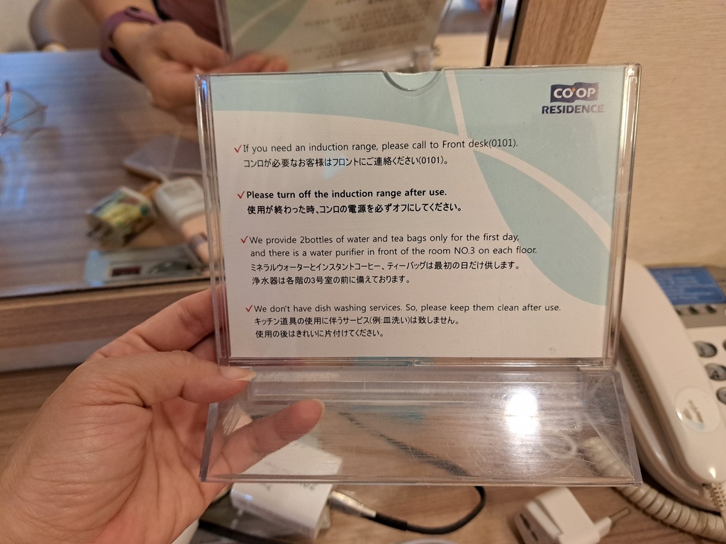 前2天我們都不知道有飲水機,還自己燒開水,後來才看到桌上的告示牌,才知飲水機是在每個樓層的3號房外面!