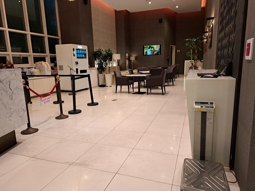 大廳外面的休息區,但Google評論有人說這裡只供茶水使用,不可以吃東西,我們都直接回房間吃,沒有這個困擾。