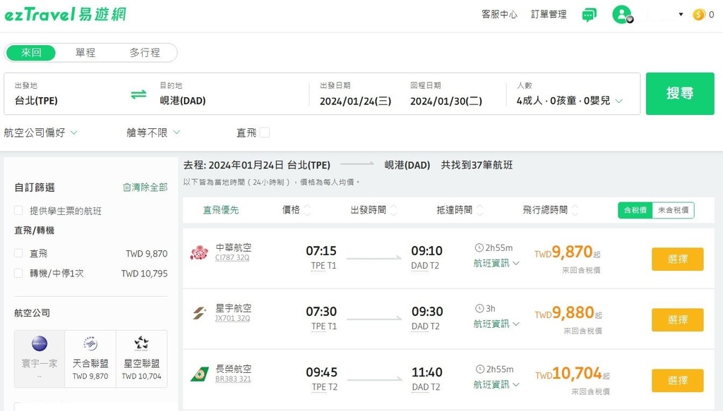 由於Skyscanner低價的前幾名都是國外的OTA就略過,直接查國內的易遊網,本來也想直接就訂長榮了,但後來想想09:45起飛,當天要從大林上去其實也是三更半夜要出門,可能還是要前一晚先北上過夜比較安心,既然都要多花住宿費了,華航比長榮還便宜834元,全家就差了3千多元,來付住宿費就夠了!