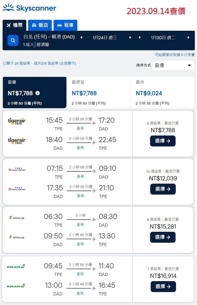 大概是因為星宇增加到一天2班的關係,不管早去晚回還是晚去早回價格居然都差不多!但航班排列組合選擇多很多!