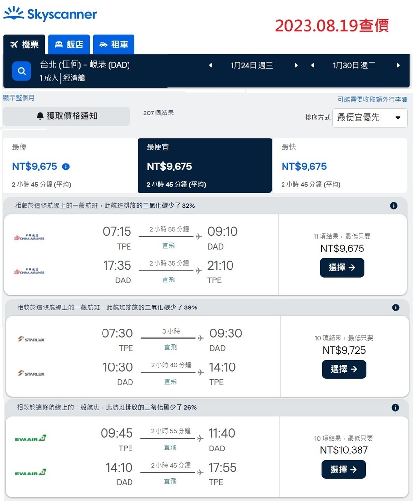 目前(2023.08.18)飛峴港有三家航空,華航、長榮、星宇都是傳統航空,價格都落在1萬上下。