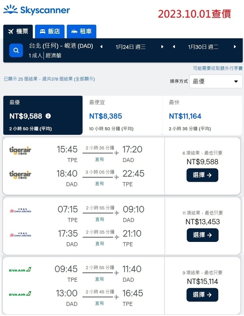 果然9月初虎航開賣峴港冬季航班,查一下價格果然跟我預期差不多,來回不含餐不含行李也快8千了,這種短程線對我們這種背包客來說,其實有沒有行李和餐也沒啥關係,但晚去晚回航班時段,就比華航差很多了!