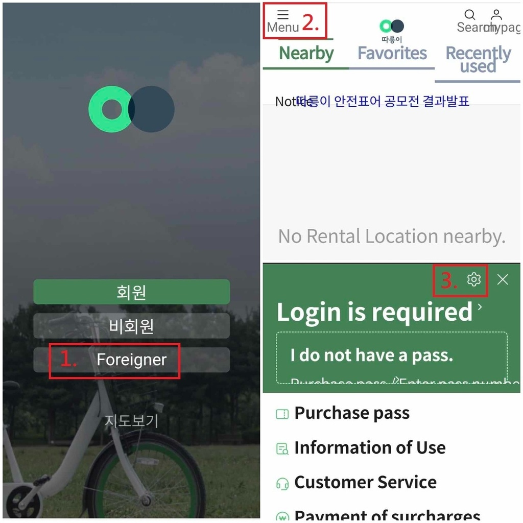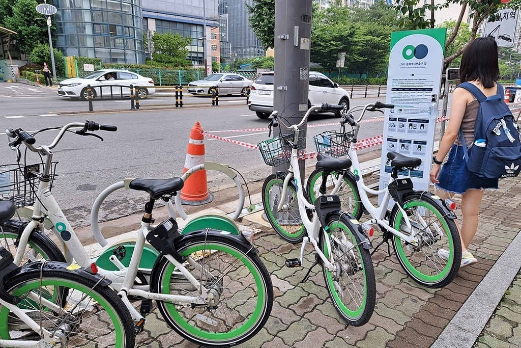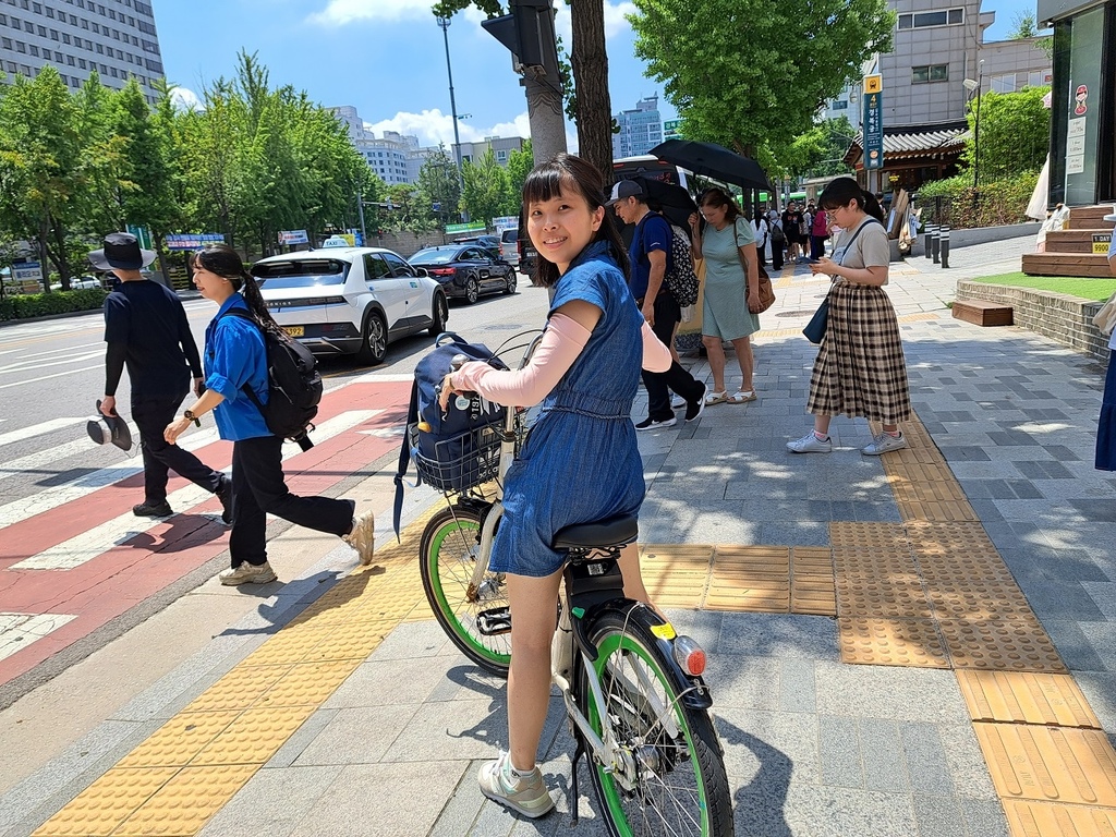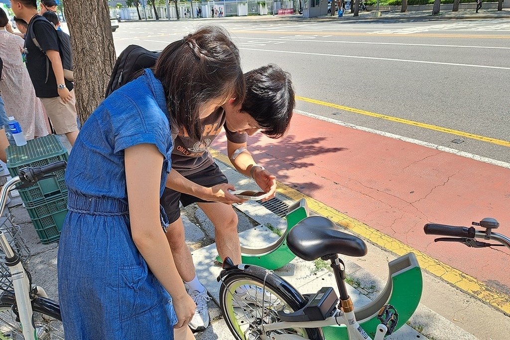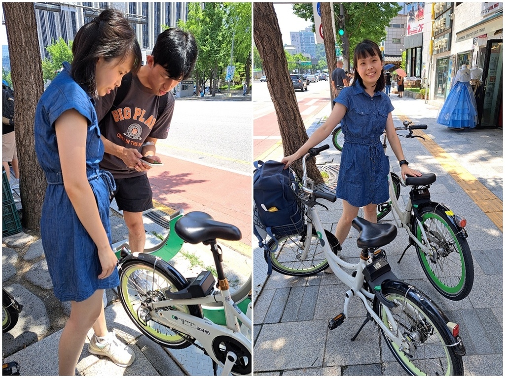 從韓服男離開後,我們要先到光化門東和免稅店換首爾城市觀光巴士夜景路線的車票(怕周末比較熱門),這段路大約950m,走路的話15分鐘內應該走得到,但剛好景福宮4號出口就有丁零零共享單車的站點,查詢光化門東和免稅店附近也有站點,想說可以免費換24小時使用券,那就來試看看吧!