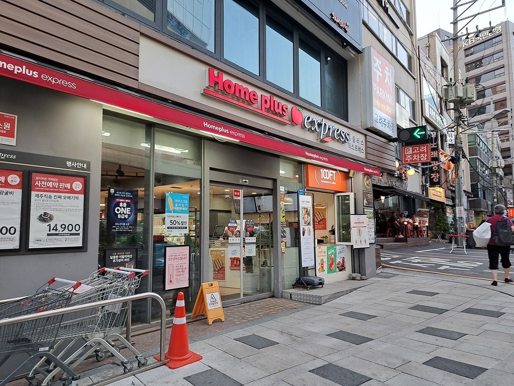一直念茲在茲的水蜜桃都沒機會買,前一天一早有經過Homeplus文來店,但因為還要跑一整天行程,也不敢進去逛;今天中午換票前無意間經過這家Homeplus express時有進去看一下,但因為還要去弘大逛,也就沒有買了。想說不然晚上回來搭觀光巴士前再去買,至少只剩搭車和最後去首爾塔,不用拎太久。