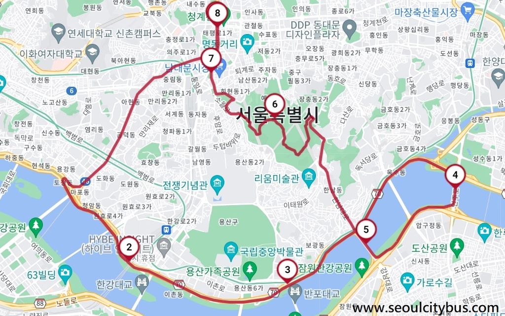 行駛路線總共會經過8個主要景點,但除了⑥N首爾塔,其它點都不會停靠喔!