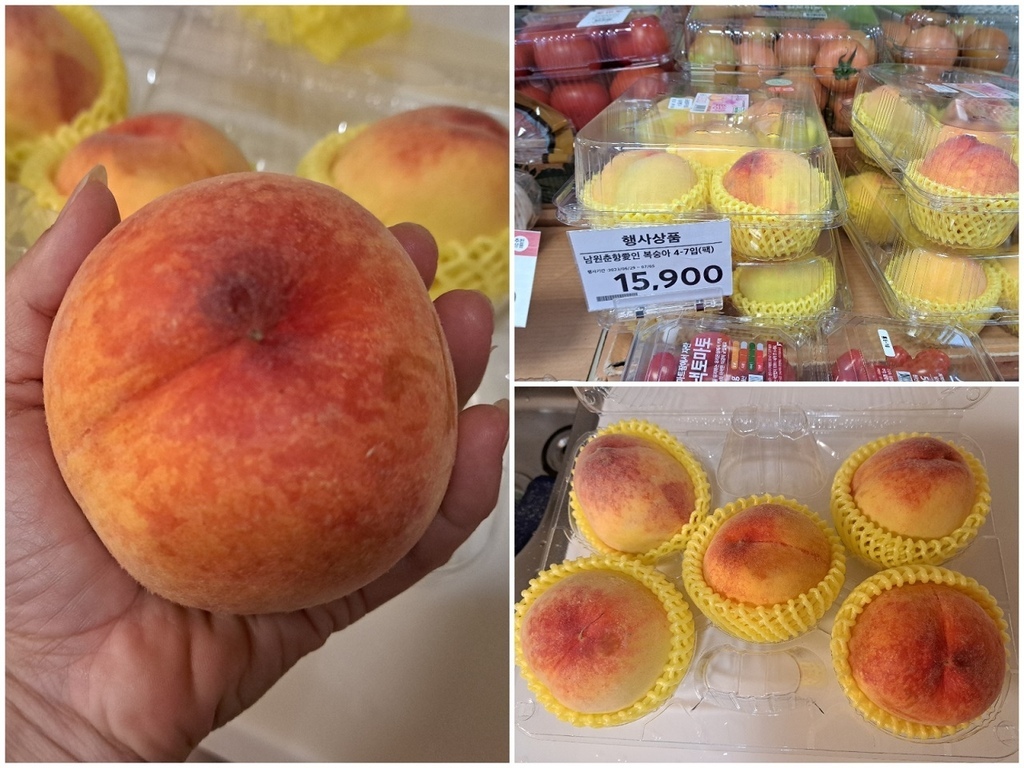 水蜜桃5個₩15900,折合台幣約380元,平均一個也要75元,其實也沒想像中便宜,但太久沒吃到這種水嫩多汁的水蜜桃,想想台灣這種大小一個至少要150元起跳,那就買了吧!不然再來就要等到回國前兩天才能去樂天超市買了!
