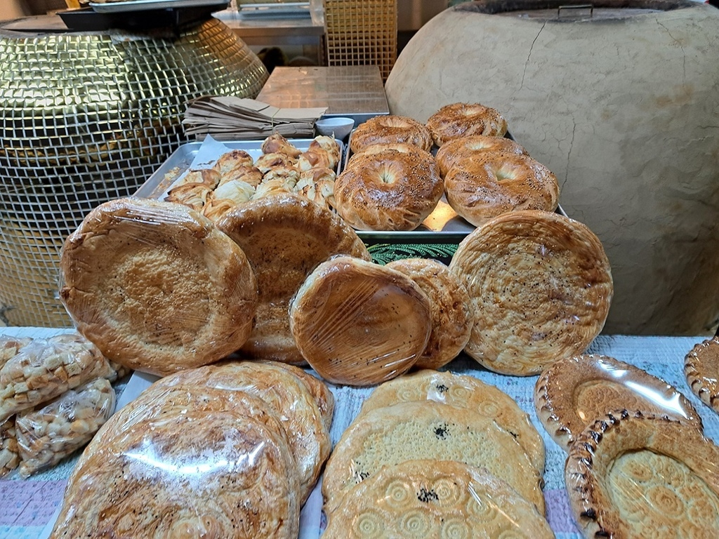 第4天難得晚上8:30左右就回飯店,店家還沒打烊,看到呈圓形、扁平狀的烏茲別克麵包Lepeshkas,或稱為Obi-Non,都是在這種坦都爐Tandoor中烘烤的,這種扁平印花模樣有點像我們的中式喜餅。