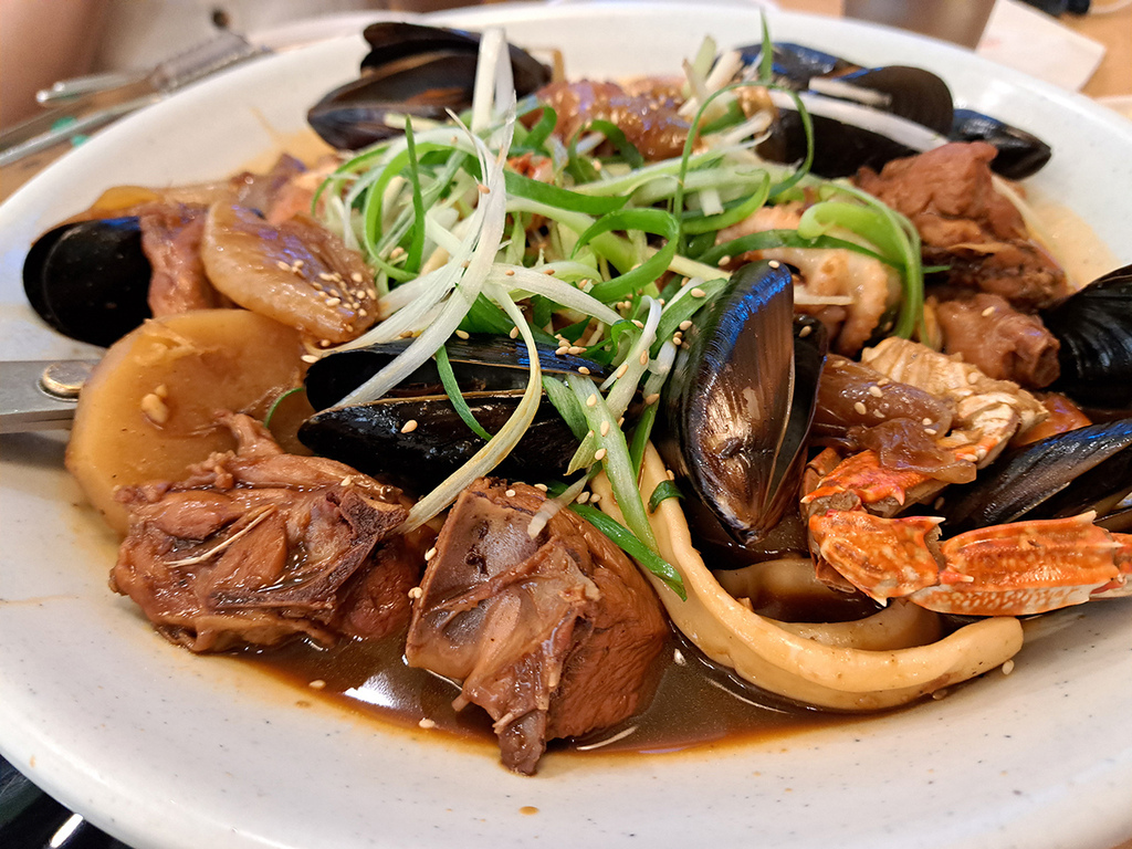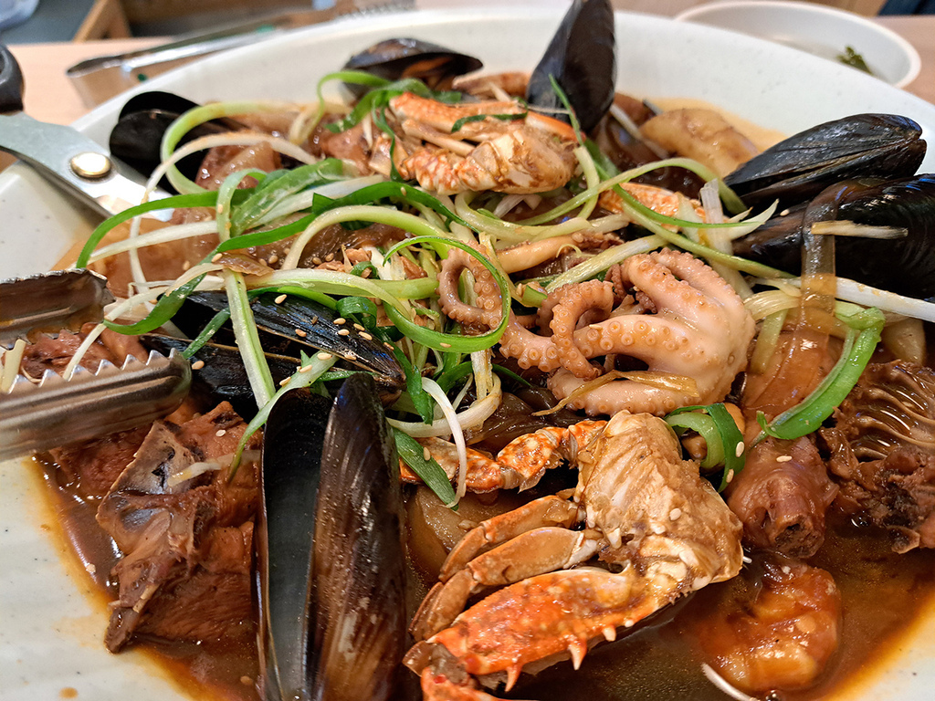 「安東燒雞海鮮鍋」比基本的「安東燒雞鍋」多了大量的海鮮,有蝦、蟹、花枝、章魚和九孔!