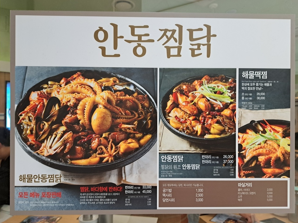 本來要點最便宜的中間「安東燒雞鍋」,但隔壁桌剛好又是台灣人,說那種很辣,建議我點後面那桌那種,於是我們拿菜單去問後面那桌韓國人是點哪種?原來是最左邊,也是店內招牌的「安東燒雞海鮮鍋」₩33000;最右邊則是「海鮮年糕鍋」₩29000。這價格都是2人份,下面一排的價格則是3人份,份量也比較多。