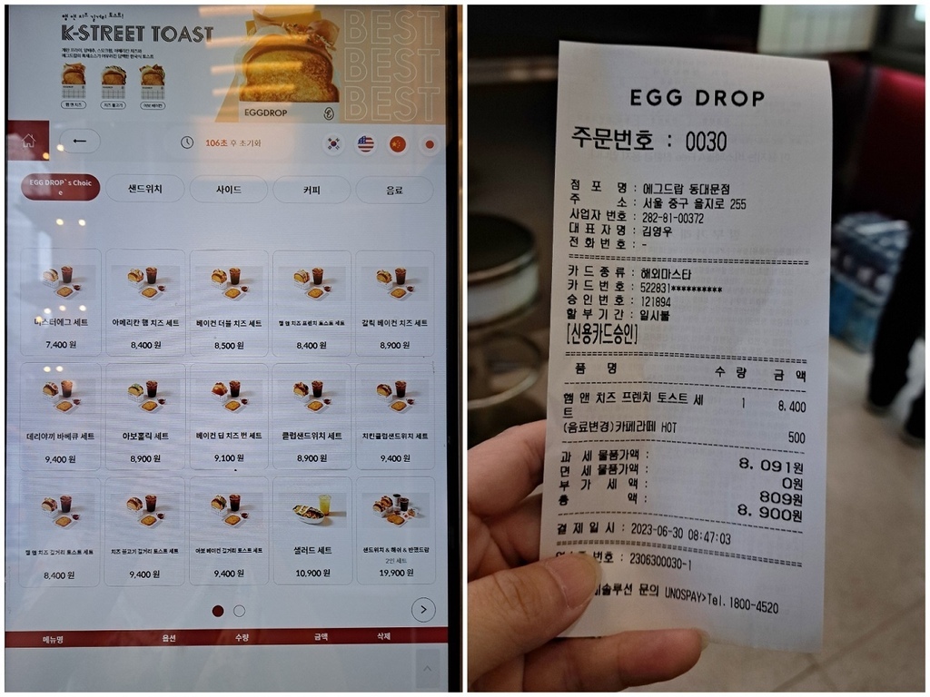 先在門外先用點餐機自助點餐,本以為只有套餐選項,便點了火腿起司法式吐司套餐₩8400,有附薯餅和美式咖啡,但我不喝美式,就加價₩500升級拿鐵,總價₩8900,折合台幣約212元。