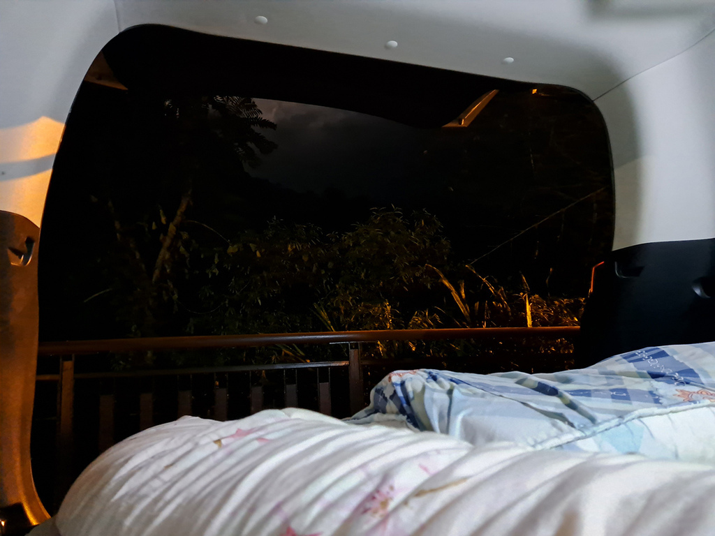 這裡晚上真的很安靜,也沒有蚊蟲,氣溫大約16-19度,我們車窗只有開一小縫,蓋薄被也就夠了,一夜好眠!
