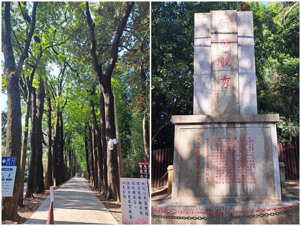 入口「新苗競秀」碑立於民國 49年,碑座記載當時創建新威苗圃的歷史。