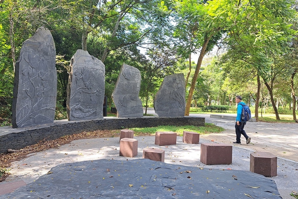 幾塊繪刻花朵、毛蟲、蝴蝶與新威大橋圖案的大石板,代表茂林國家風景區的主要特色。